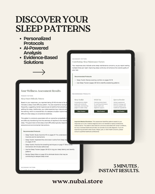 After years of gut issues, brain fog, energy crashes, and chronic insomnia, I created Nubai by combining traditional Sudanese herbs (baobab, hibiscus, Arabic gum) with science-backed ingredients to make SOLH tea (sleep) and QUWWA powder (energy & gut health).
