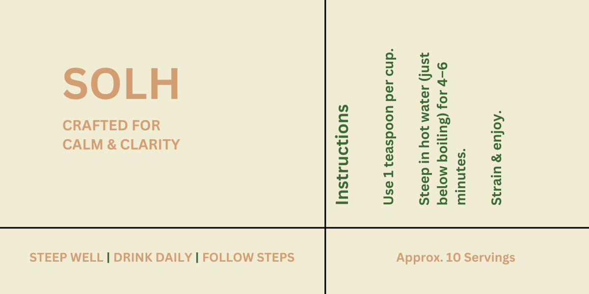 SOLH – a calming herbal blend crafted for daily balance and clarity. This 100% natural loose-leaf infusion combines ginger, lemon balm, raspberry, honey, cinnamon, and moringa with cooling peppermint and hibiscus/kirkadeh to support relaxation, digestion, and mood regulation.